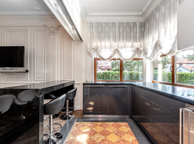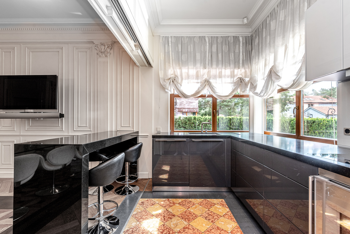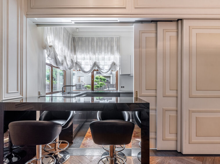 Virtuvę galima atskirti nuo valgomosios zonos slankiojančia medžio masyvo durų konstrukcija. Buitinė įranga, vyno šaldytuvas “Gaggenau” “Miele”.