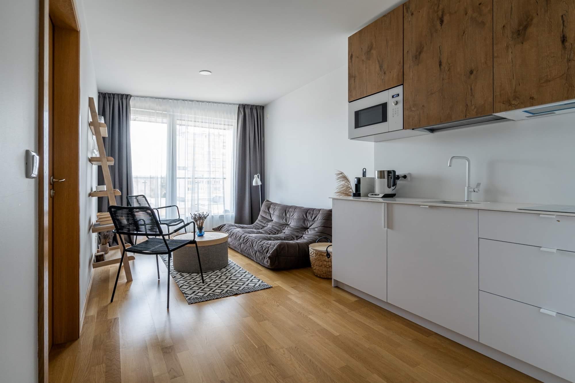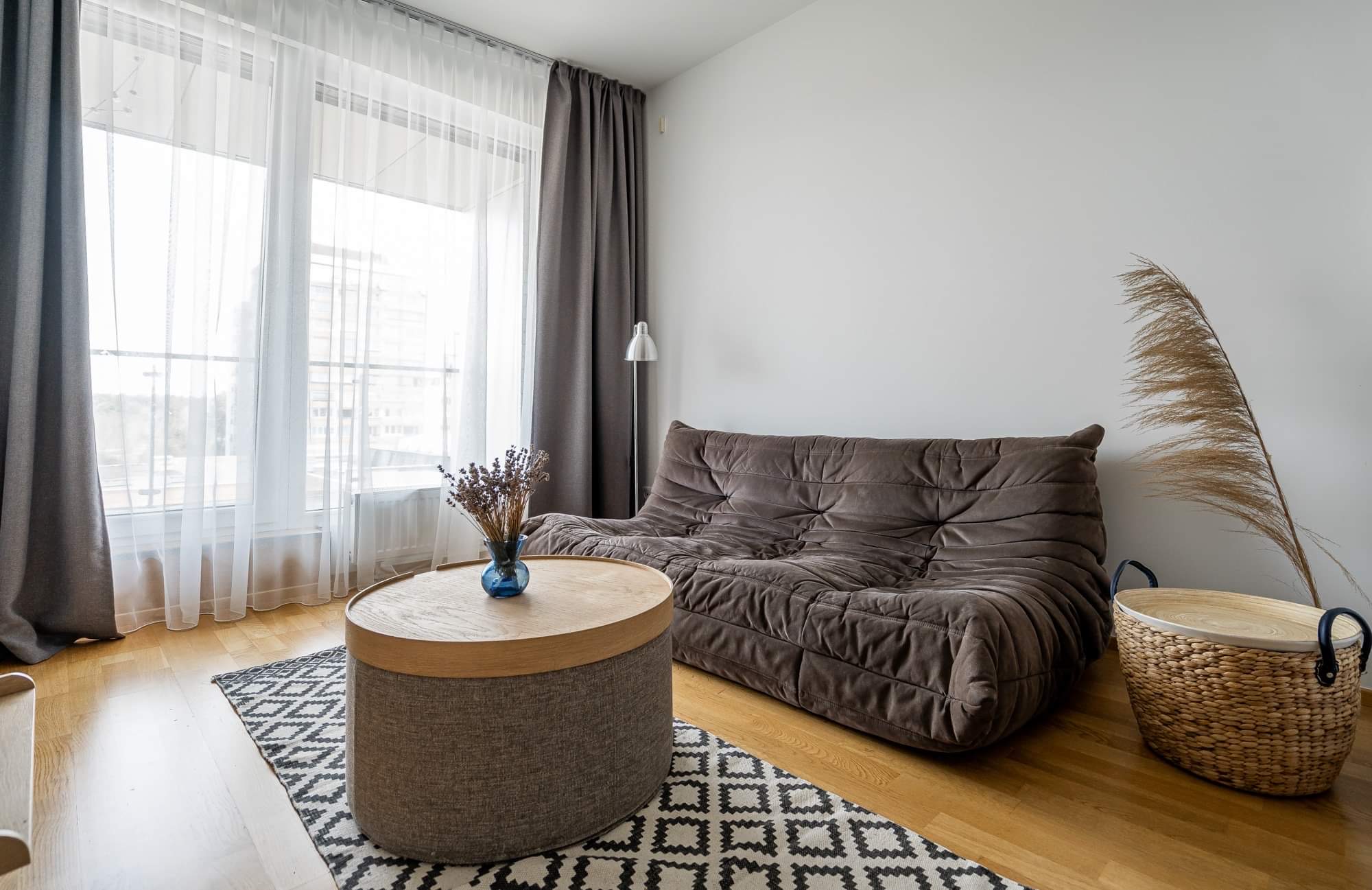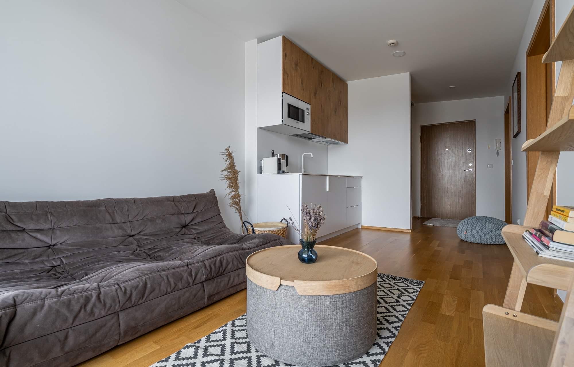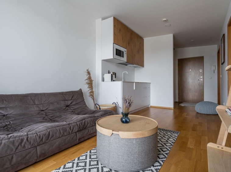 Didelė terasa (apie 14 kv.m.), kuri vasarą tarnauja kaip atskiras kambarys.