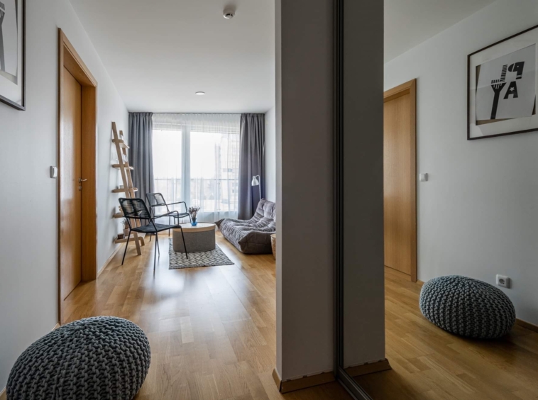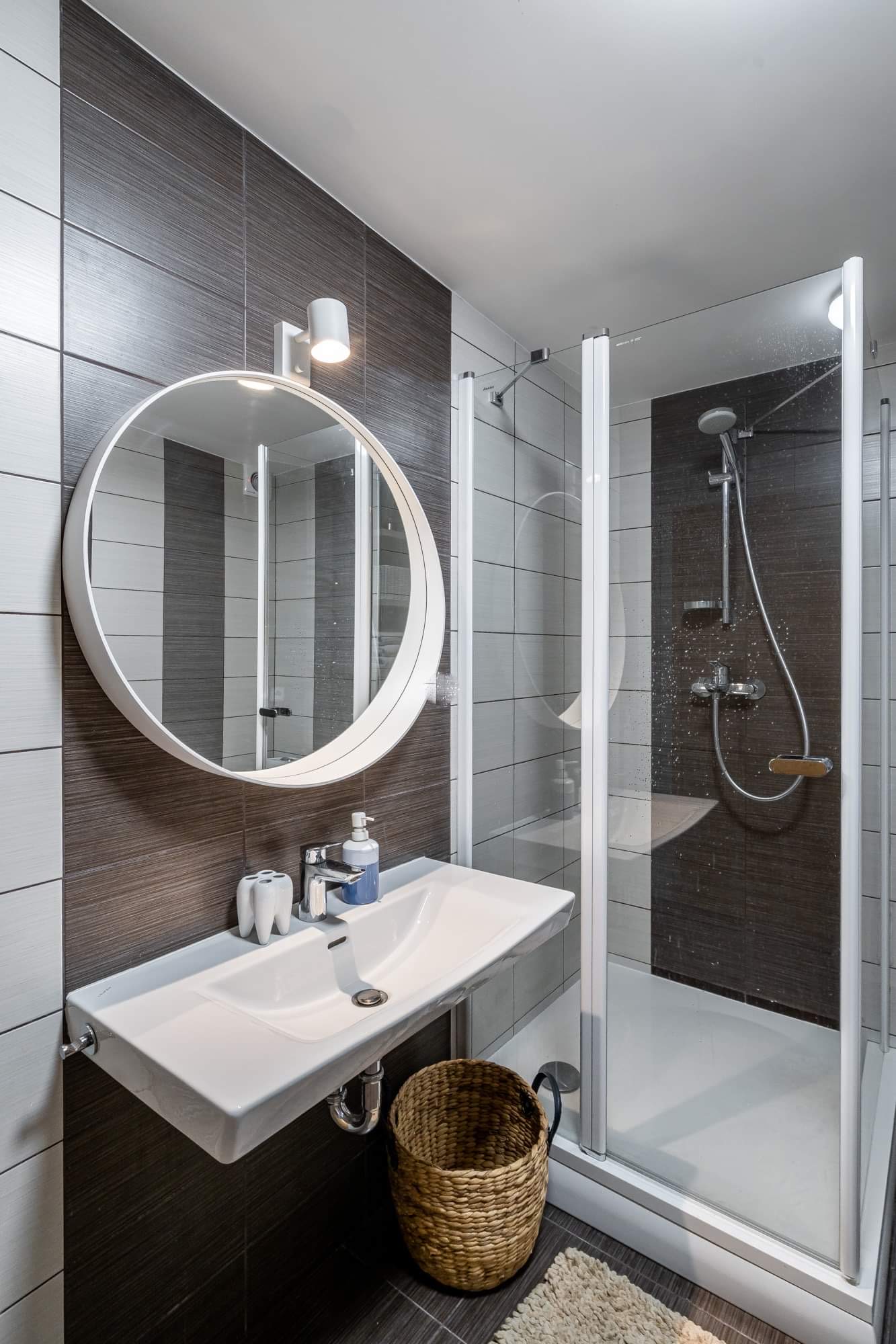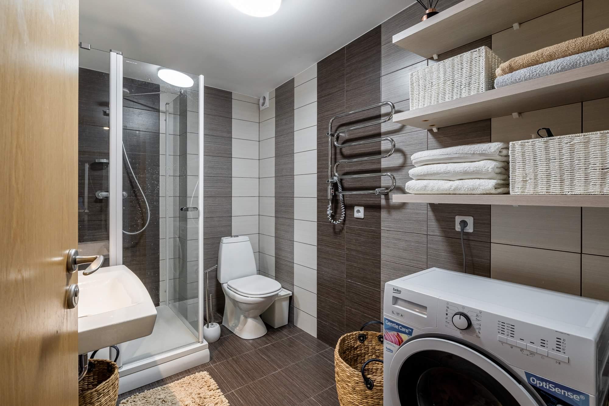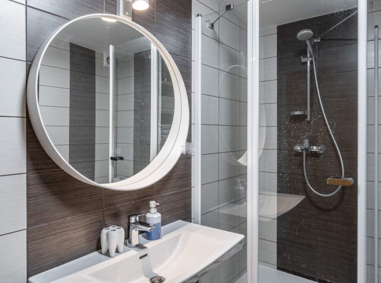 Grindys – kambariuose laminatas, dušo kambaryje plytelės ;