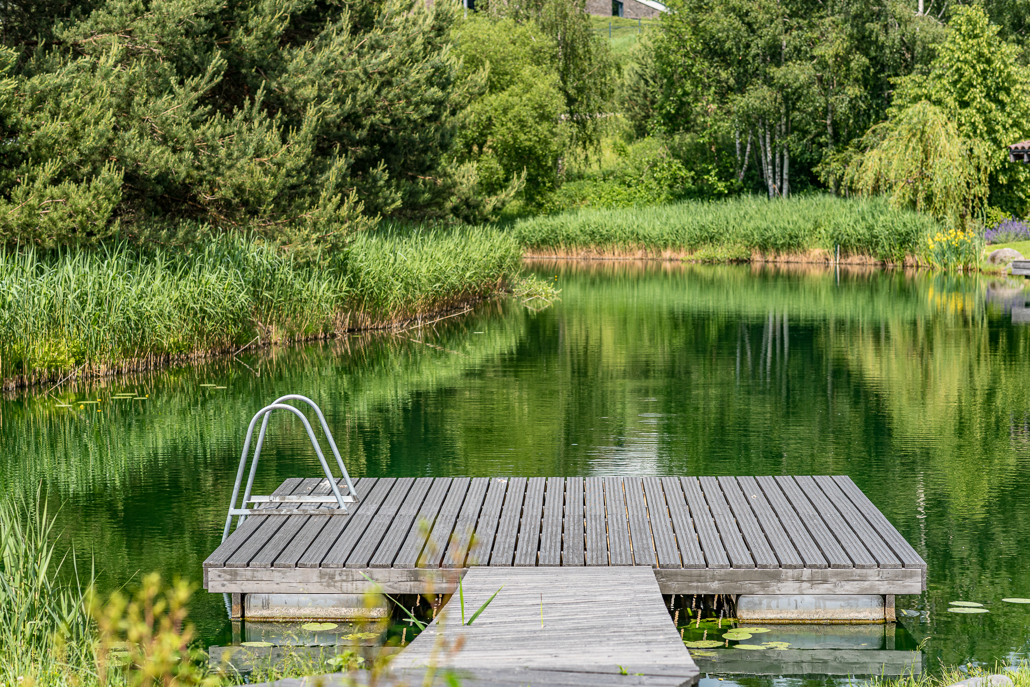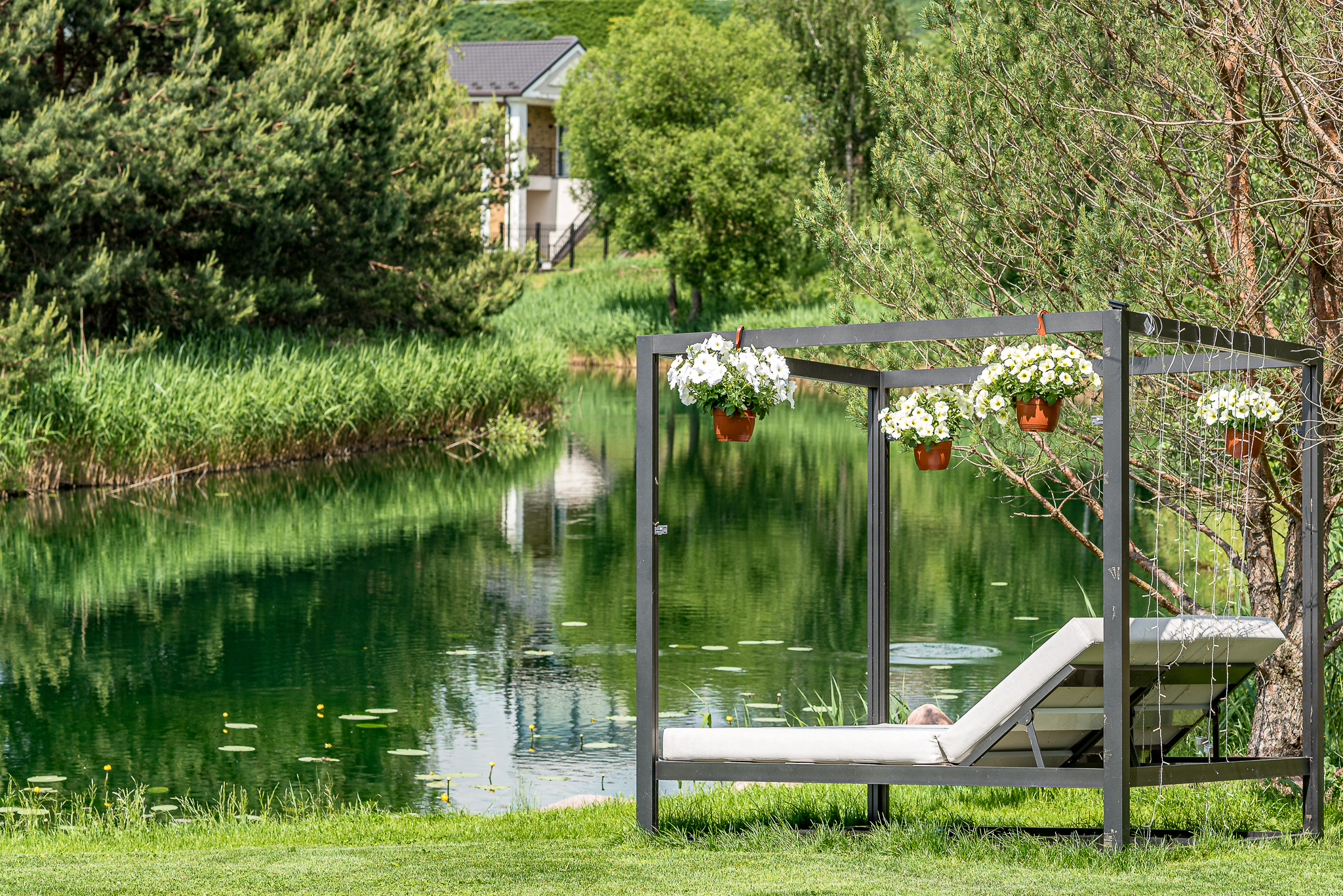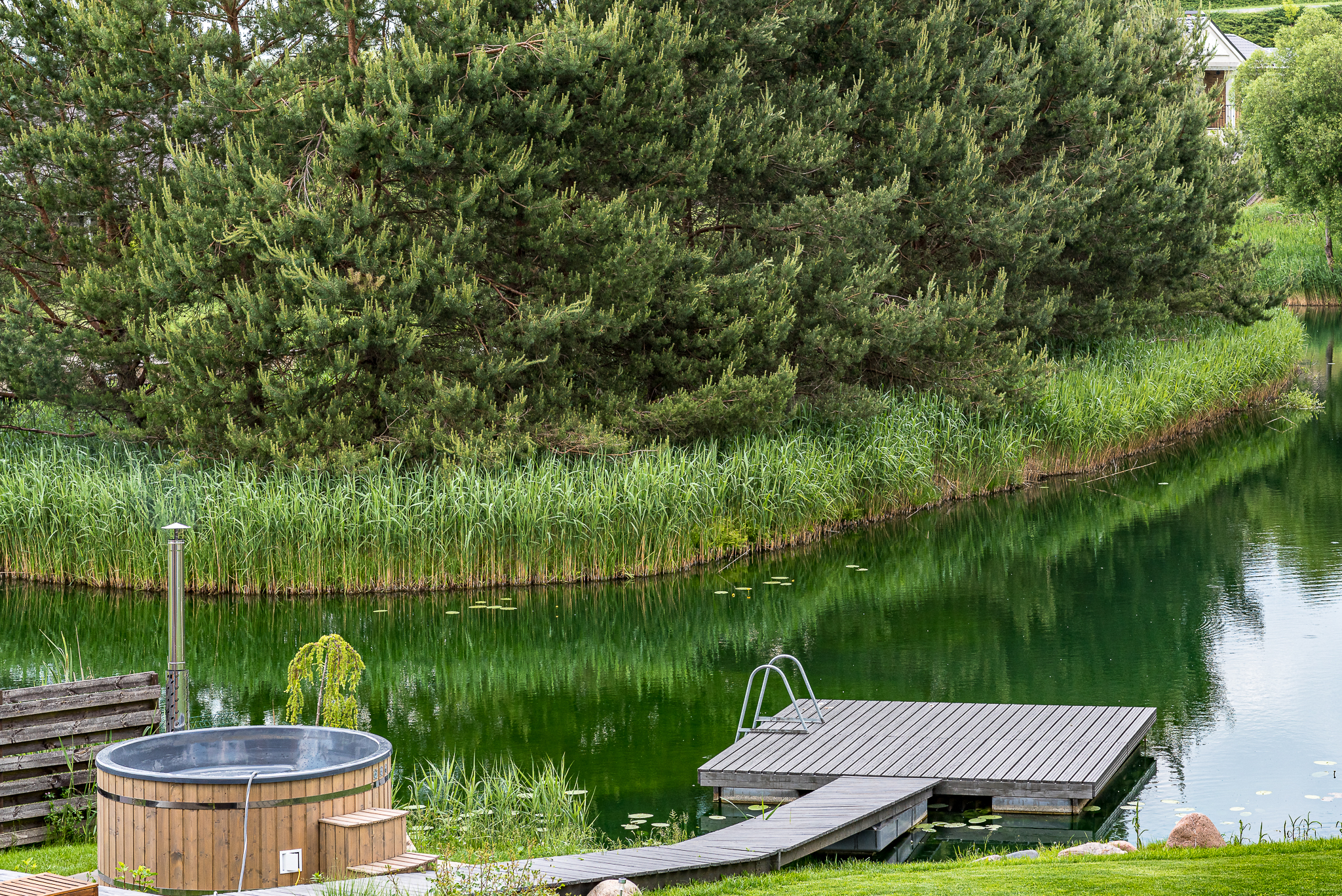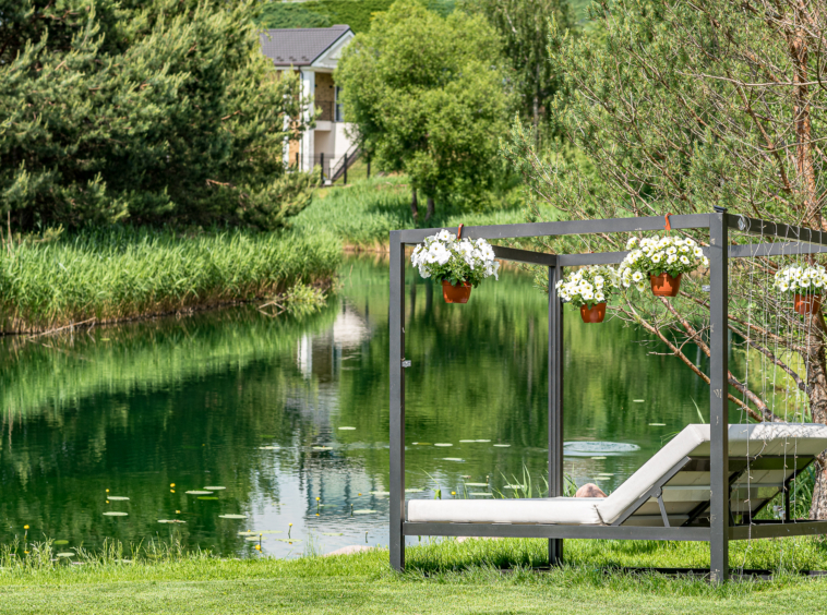 Išpuoselėta apželdinta žaliuojanti aplinka, vandens tvenkinys, daugiamečiai augalai, .