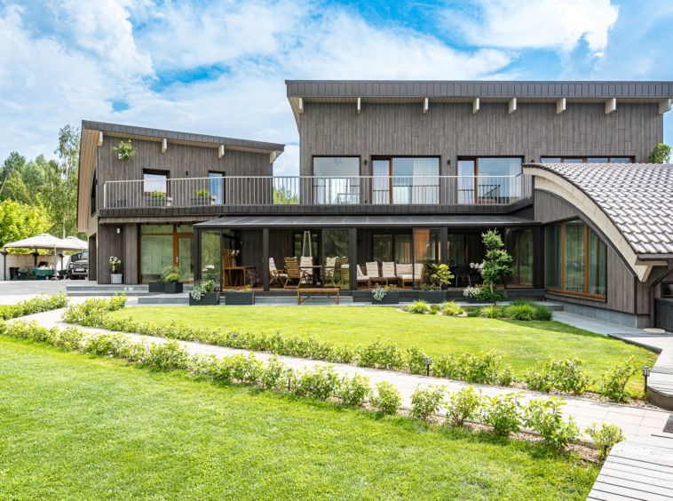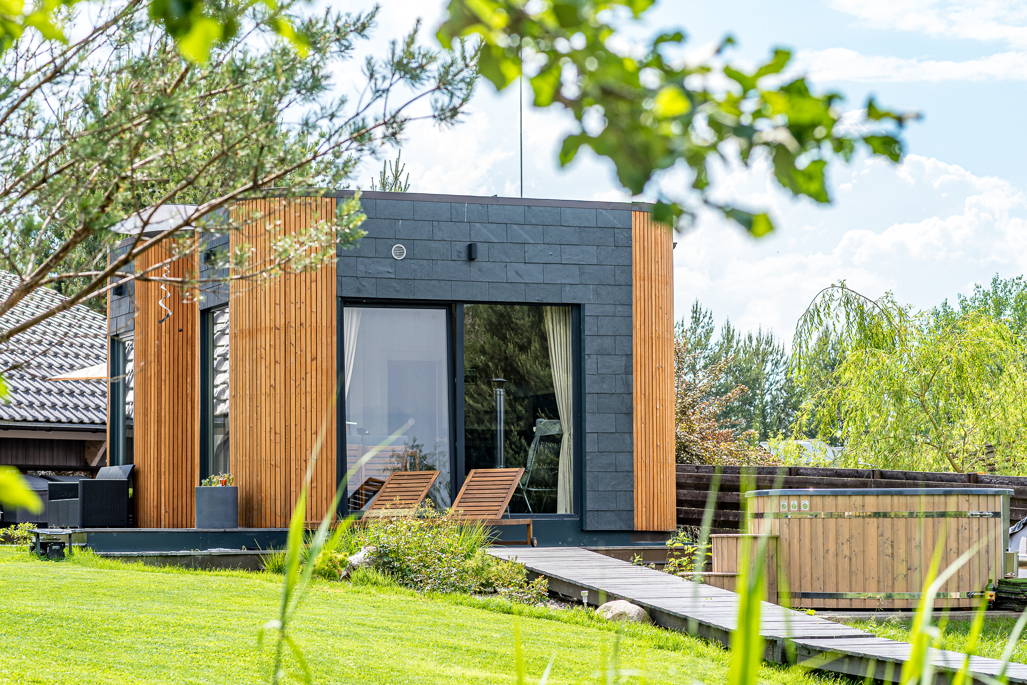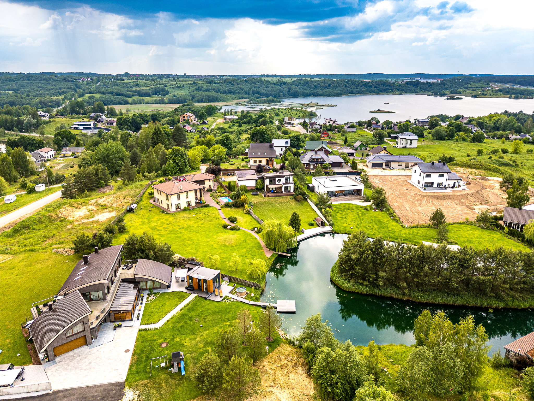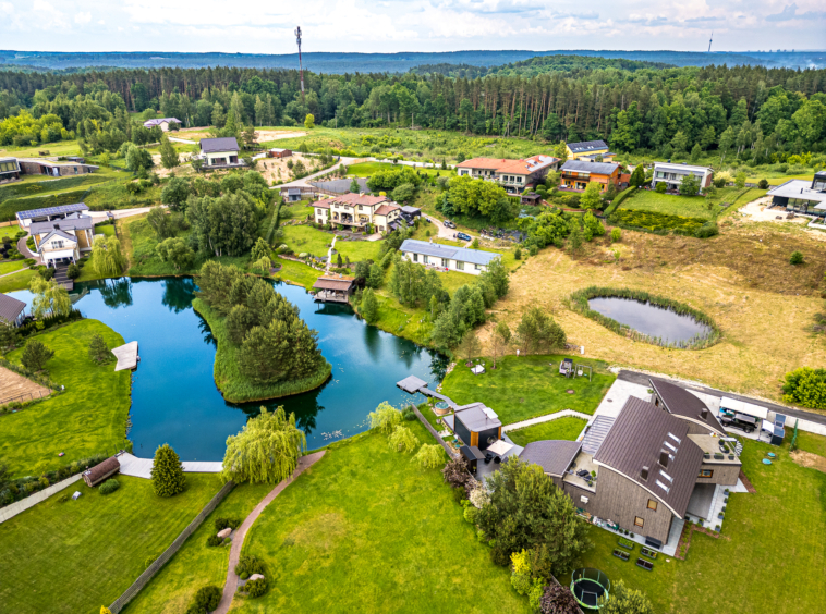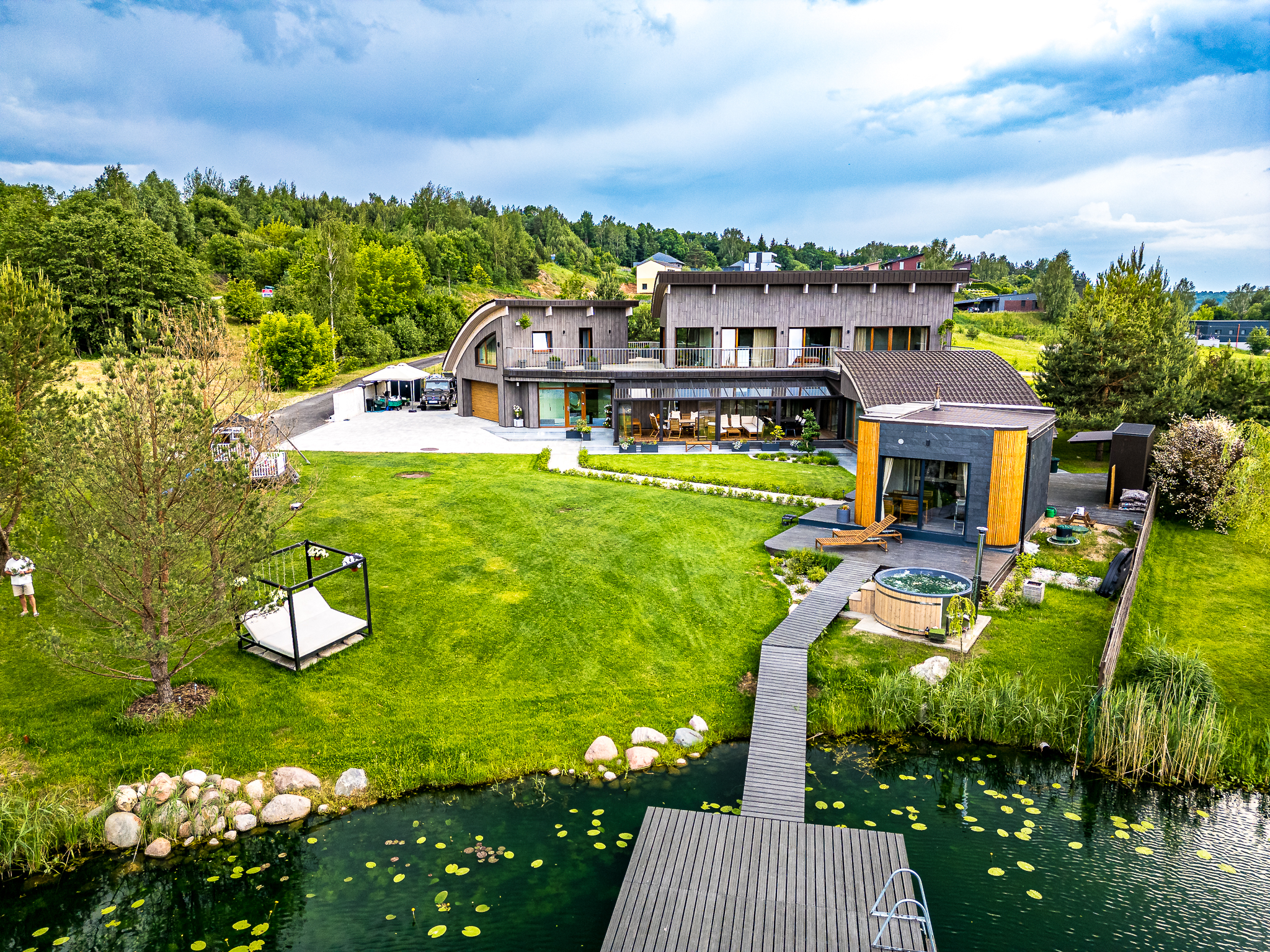 Išpuoselėta apželdinta žaliuojanti aplinka, vandens tvenkinys, daugiamečiai augalai, .