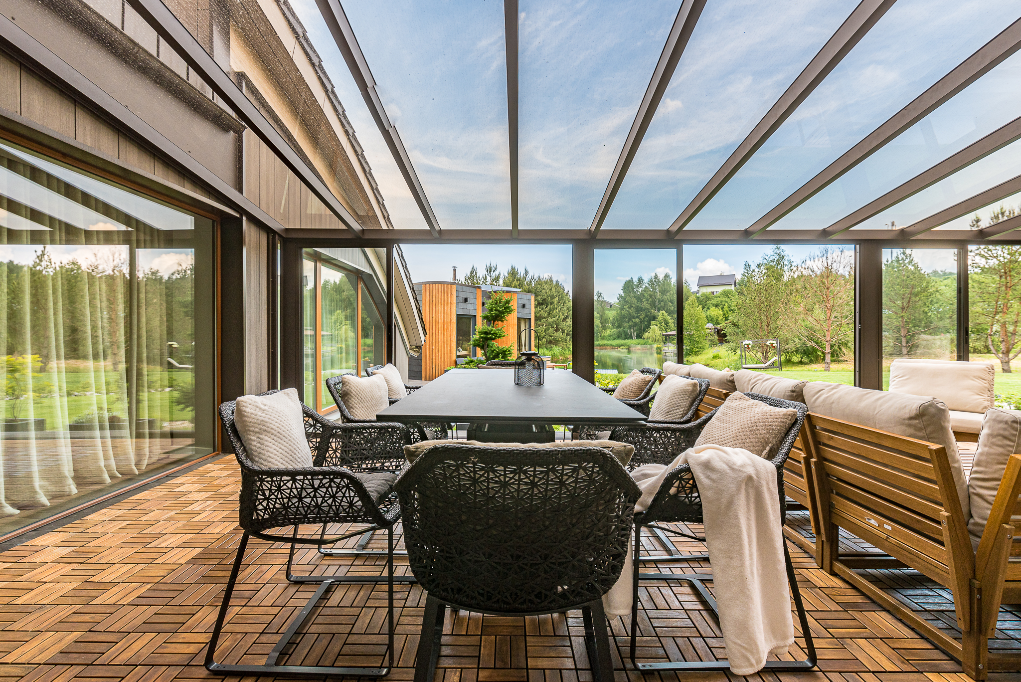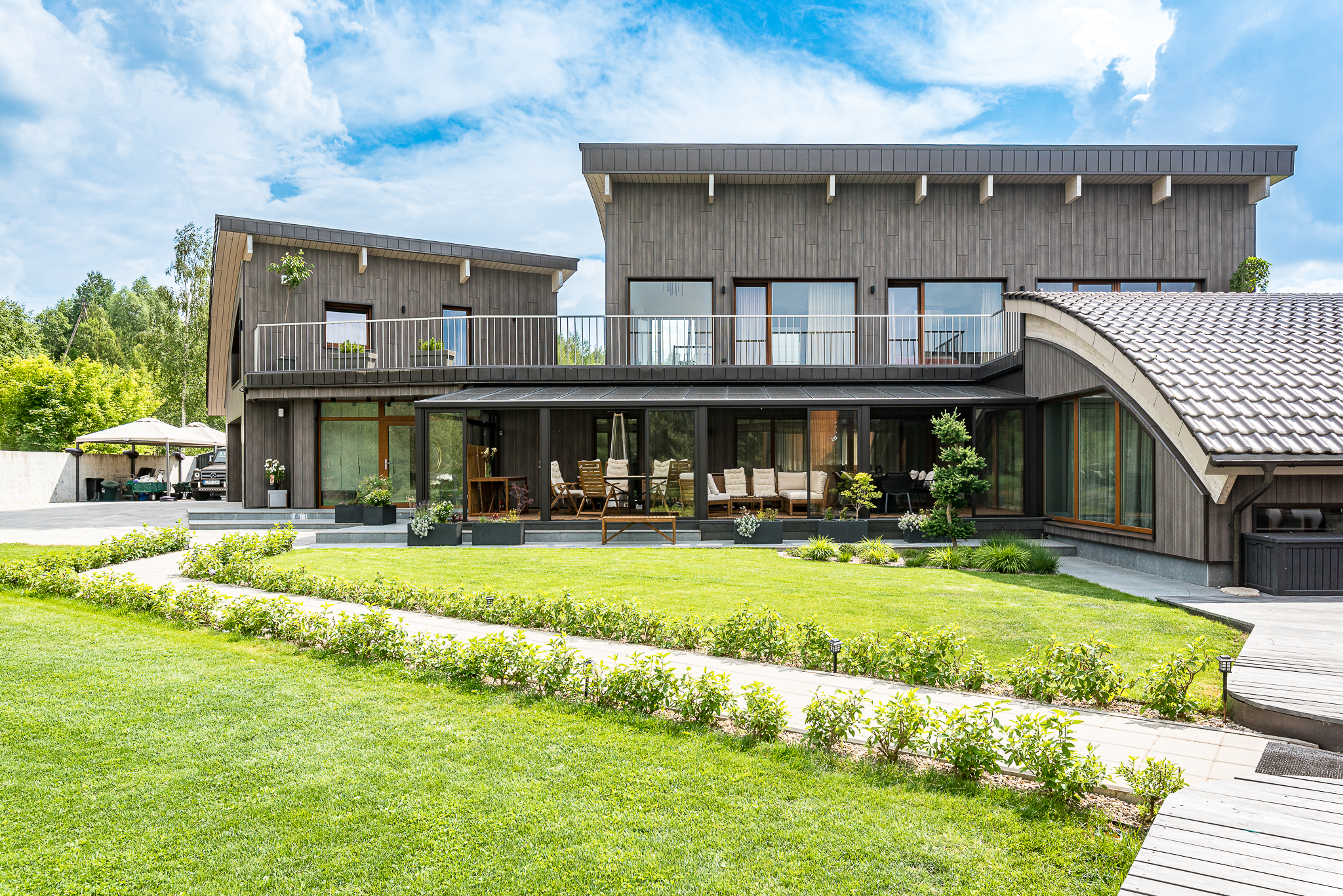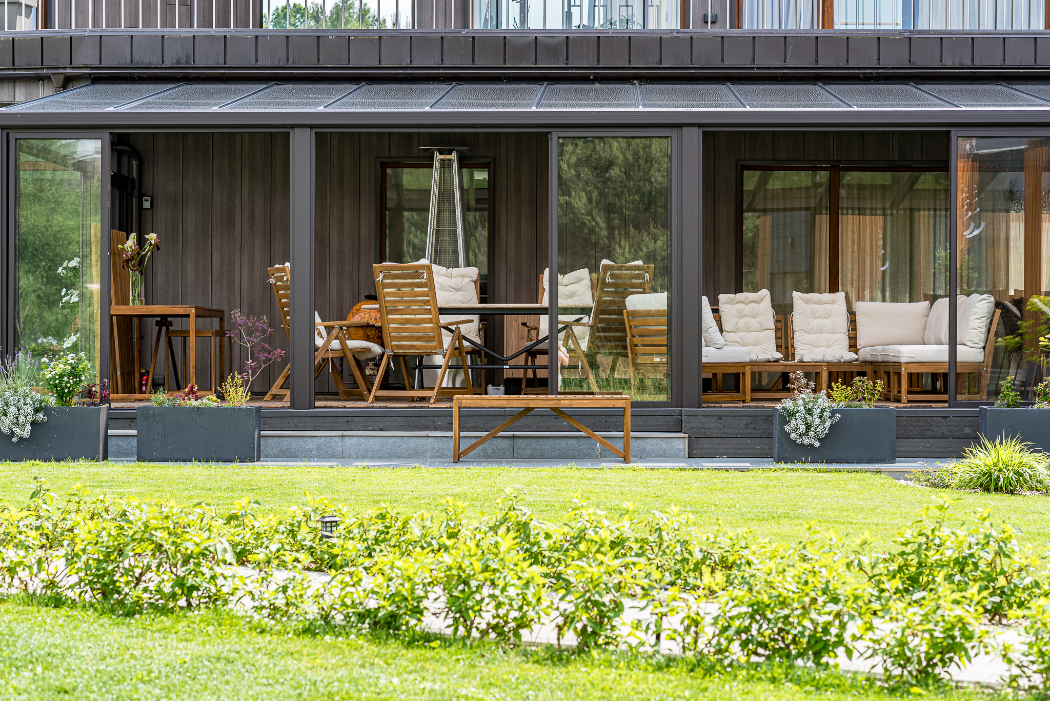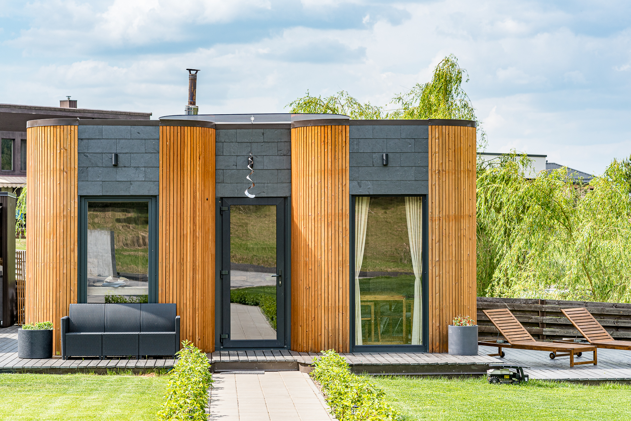 Išpuoselėta apželdinta žaliuojanti aplinka, vandens tvenkinys, daugiamečiai augalai, .